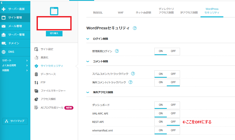 - 「REST API」 利用設定のみ、エラーが出る場合は 「OFF」 にする