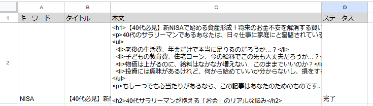 - スプレッドシートのA2セルに、テスト用キーワード(例:「NISA」など)を入力します。