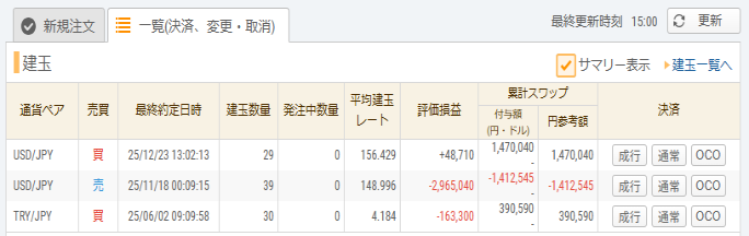 「円高になる!」と信じてドル円をショート(売り)した結果、円安が止まらず、含み損が雪だるま式に膨れ上がりました。しかも、ビビって両建て状態です。